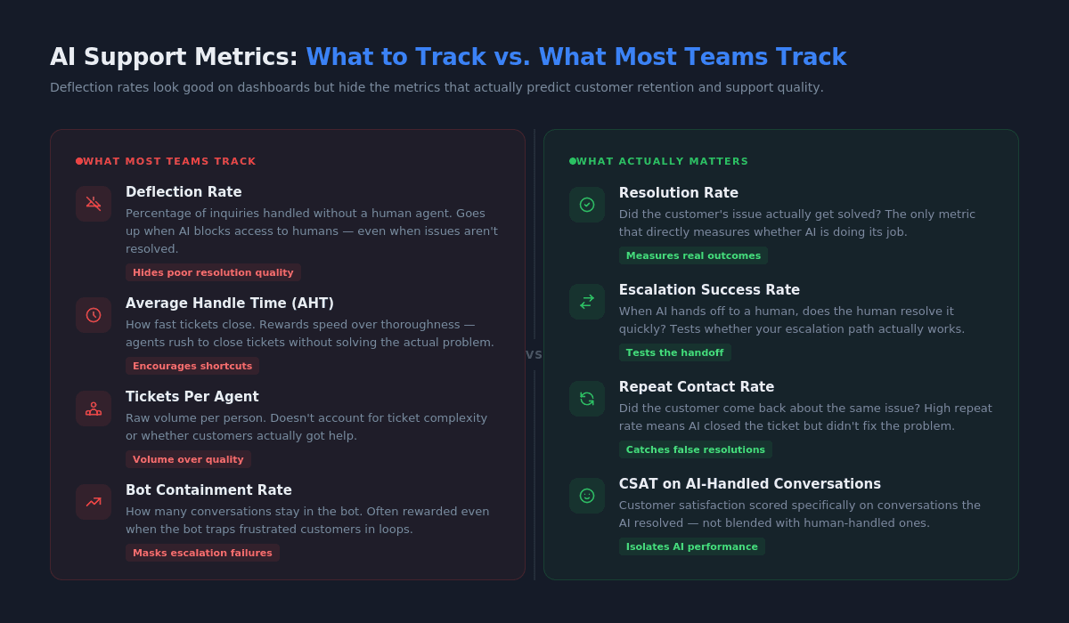 This is where a lot of AI support projects go sideways. Teams measure success by deflection rate — the percentage of inquiries handled without a human agent. The number goes up, leadership celebrates, and nobody looks closely at what's actually happening inside those deflected conversations.