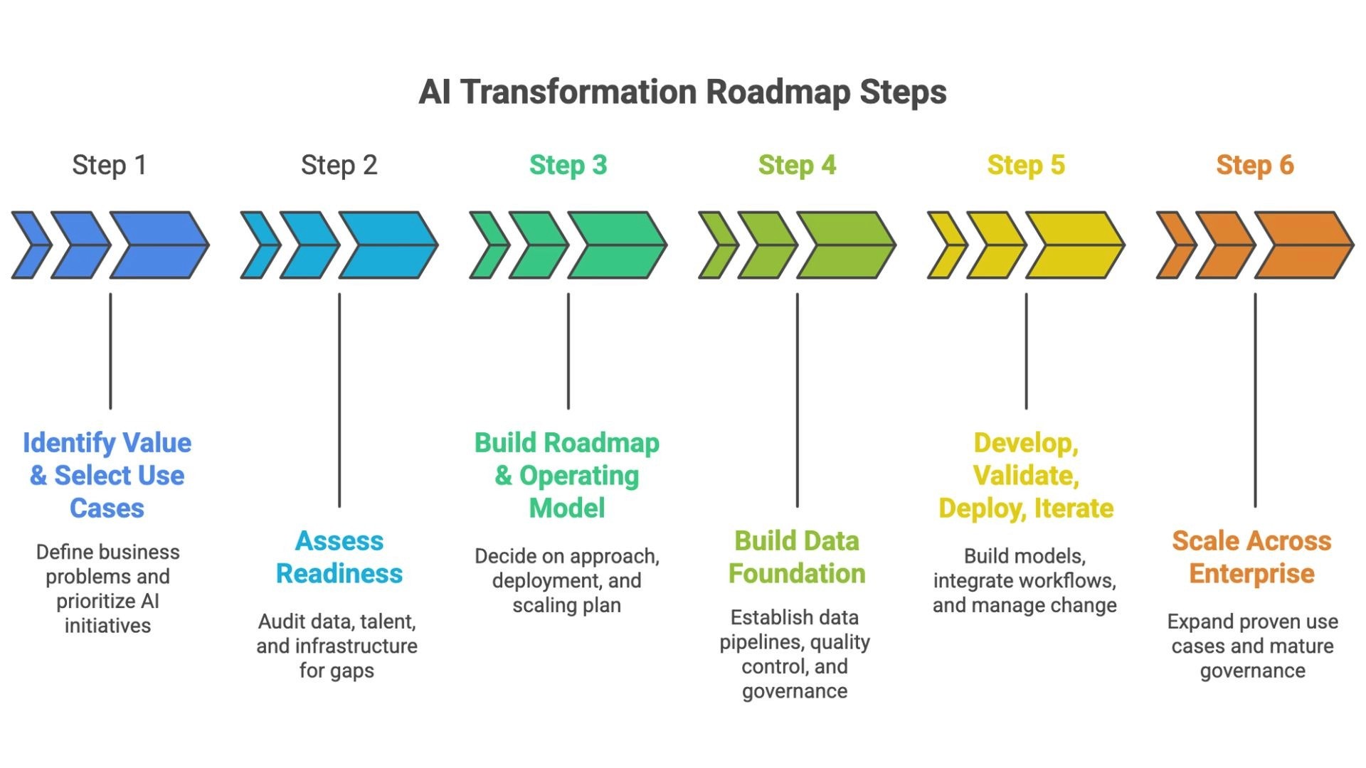 Below is the 6-step AI transformation roadmap we use at Novoslo. It's designed for operationally complex organizations that need to balance quick wins with long-term infrastructure.