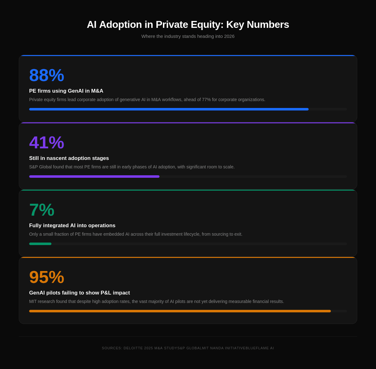 Private equity firms have spent the last few years talking about AI. The tools are available, the budgets are growing, and the use cases are well documented. According to Deloitte's 2025 M&A Generative AI Study, 86% of organizations have now integrated generative AI into their M&A workflows, and PE firms lead adoption at 88% compared to 77% of corporate organizations. Yet results remain uneven. A recent MIT study found that 95% of generative AI pilots at companies are failing to produce measurable P&L impact. As we move into 2026, the gap between adoption and results is where most of the opportunity sits.