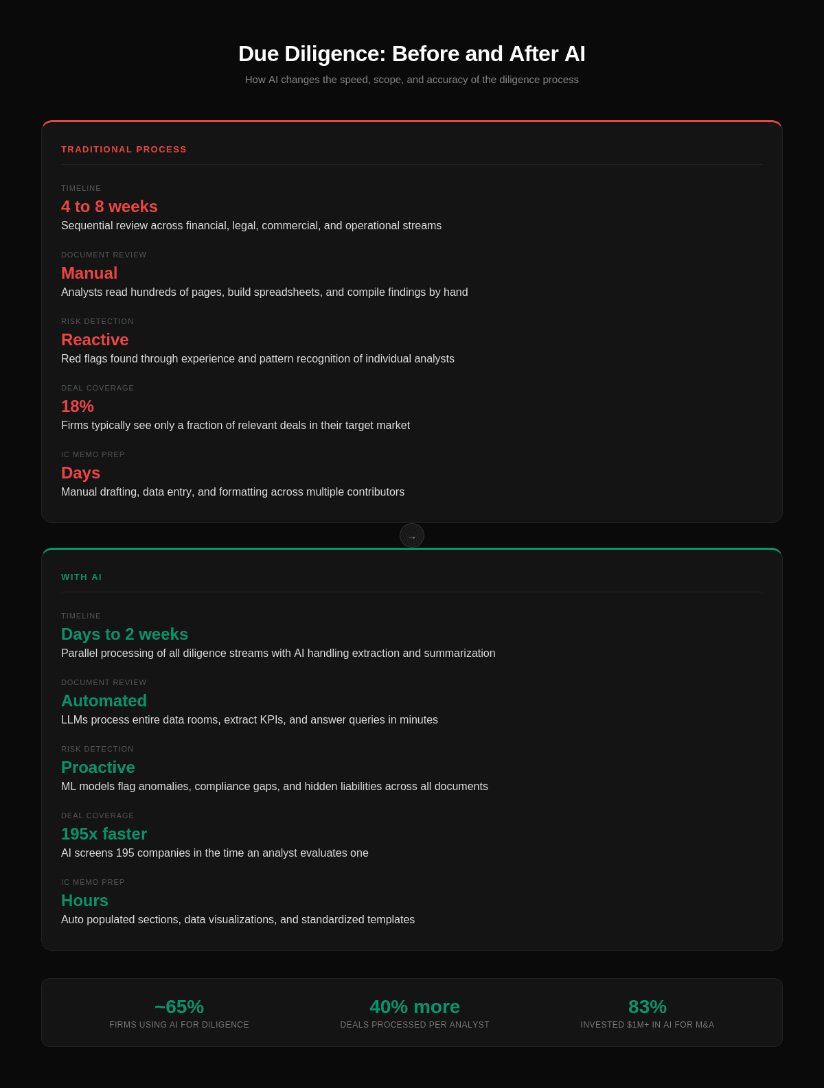 Due diligence is arguably the area where AI delivers the most immediate and measurable returns. According to Blueflame AI's adoption analysis, nearly two thirds of firms already apply AI to due diligence and data analysis, and smart teams are cutting deal evaluation timelines from weeks to days through automated financial modeling and preliminary screening. Large language models can now run Q&A sessions across entire virtual data rooms, extracting key performance indicators, churn metrics, and cohort data from hundreds of documents in minutes rather than the days or weeks an analyst would require.